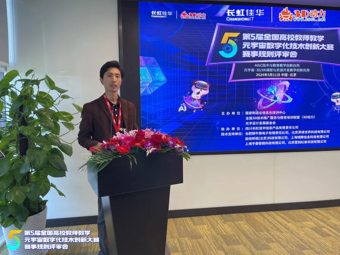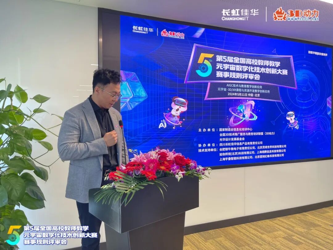 在赛事规则评审工作会议上,长虹佳华副总裁邓鹤明在致辞中表示,长虹佳华作为科技服务企业,为众多世界五百强品牌提供智能化、规模化、行业场景化的综合服务。长虹佳华积极响应国家号召,加快元宇宙技术、人工智能技术在高等教育的运用,帮助科技服务需求方和技术品牌产品提供方形成高效、精准的对接。希望通过此次大赛,激发3D设计和元宇宙技术的创新应用,提升教师的教学素养和教学能力,推动高等教育高质量发展。