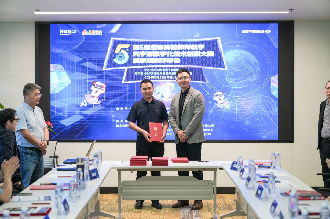签约仪式后,长虹佳华副总裁邓鹤明、全国3D/VR技术推广服务与教育培训联盟秘书长刘晓青,为大赛组委会成员颁发聘书。